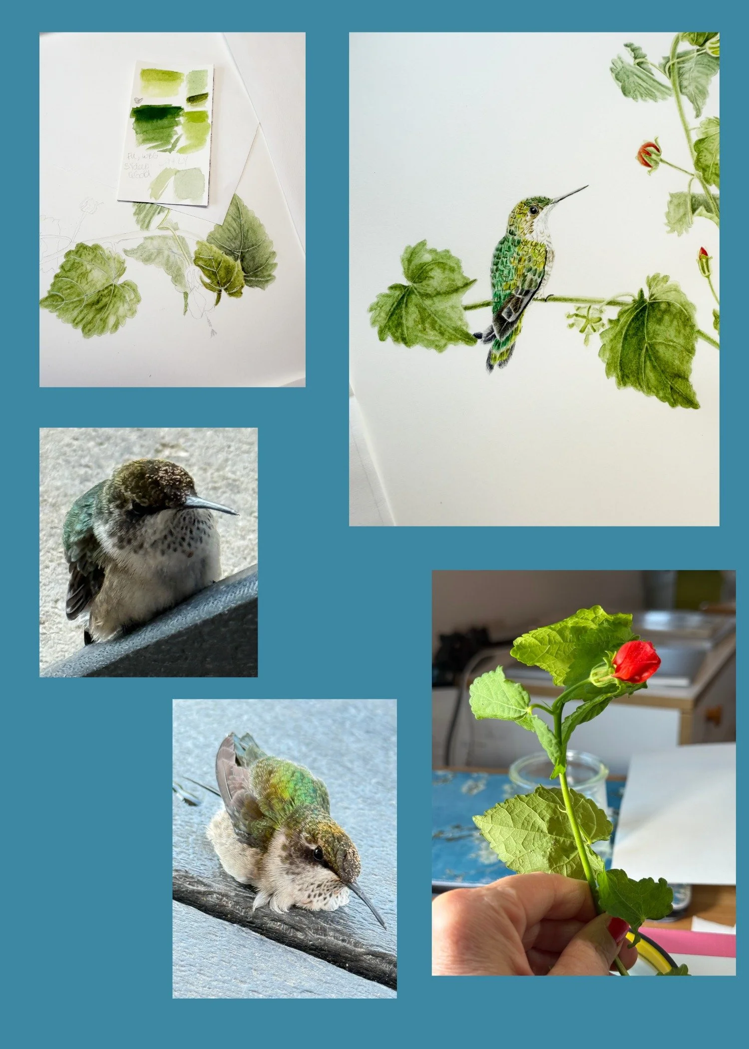 One south Texas morning in the season of hummingbird migration, a little hummer hit the window and landed right on my chair. I slowly got up, picked her up and moved her to the table for observation. She was a little stunned but still alive. We sat there for 10 mins, I was very close observing her eyelid movement, her feathers and size…. Because the next week I was drawing and painting her on my paper. This GOD wink moment answered a prayer to overcome this part of the painting that I had been delaying…. My artwork is about documenting the plants, the relationship between plants and seasons in my backyard! We have planted our garden for pollinators, hummingbirds and songbirds in the winter months. What joy to watch them feed off these plants….