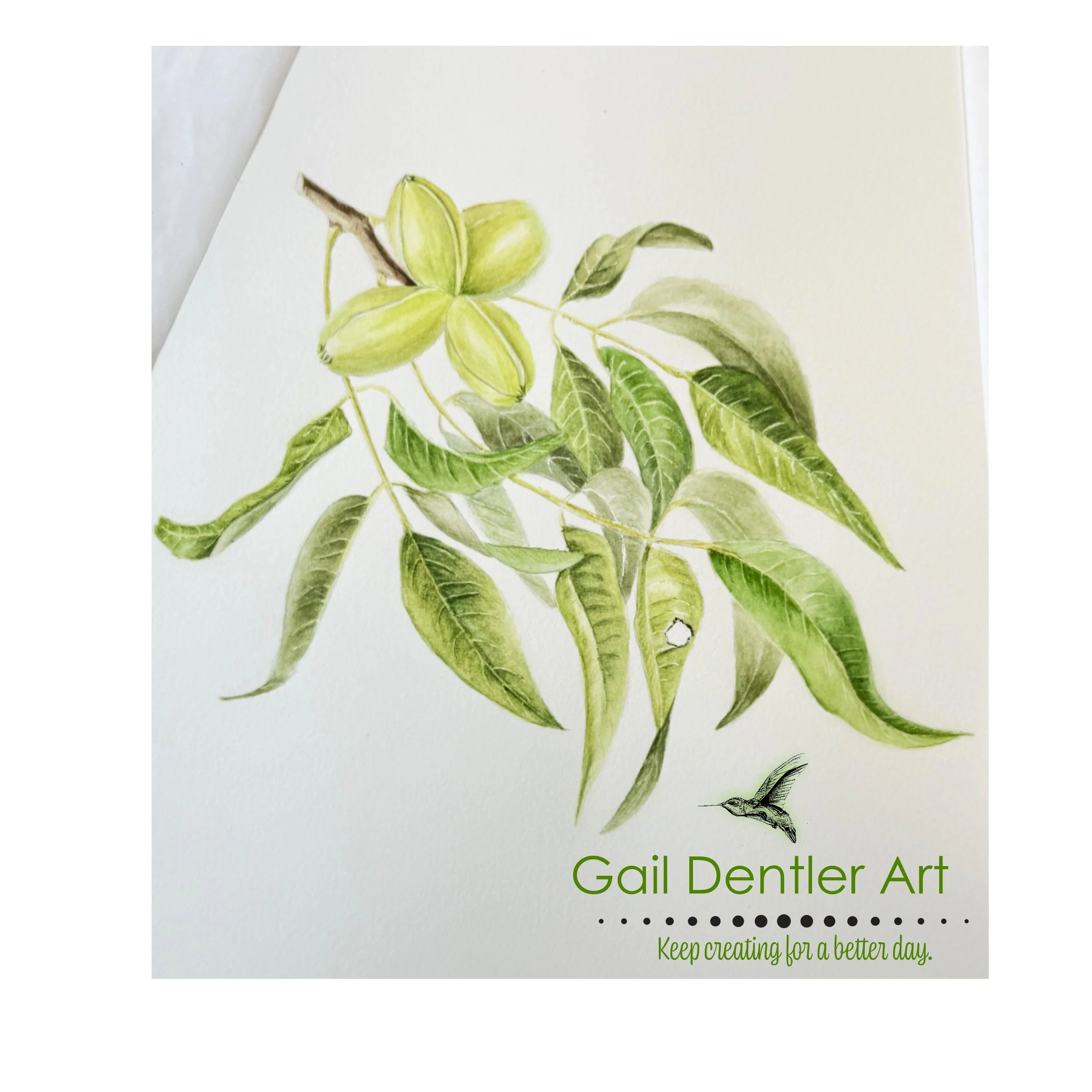 The light green husk just drew me in, it was a lovely shade of a spring green. Every morning I see this majestic tree on our walks in the neighborhood. I’ve observed it through the Texas seasons (hot, hotter and mild cold) and finally had space in my schedule for a composition.